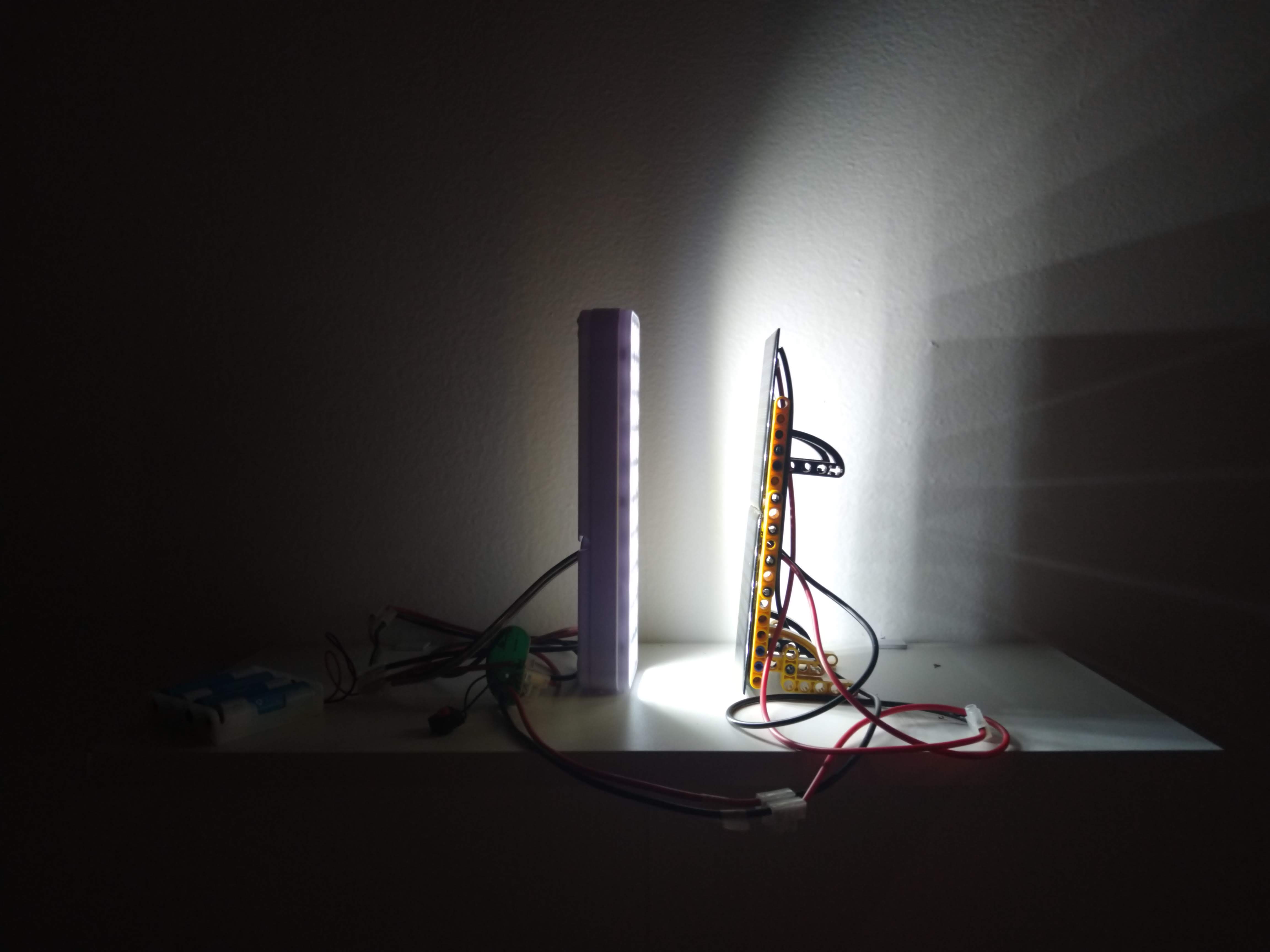 Nesse estudo surgiu a obra Quanto mais perto menos provável. Os objetos analisados são uma luz de emergência, dessas encontradas nos corredores de edifícios, e um conjunto de placas de energia solar. A luz de emergência e as placas são colocadas em frente uma da outra. Entre elas há um circuito que faz a conversão da energia coletada pelas placas solares transferindo para as baterias, que por sua vez alimentam a luz de emergência. Num primeiro momento a estrutura criada se assemelhou a um objeto de “energia infinita”, mas minha investigação queria romper esse “ciclo vicioso”, intervindo na relação entre a luz de emergência e as placas solares. Percebi que a relação entre os objetos se afeta quando dispostos em diferentes distâncias um do outro. Os dois corpos se comunicam, mas quando muito afastados, com o passar do tempo a potência da energia que circula entre eles vai se dissipando. Entretanto, se há uma luz externa (solar ou artificial) as placas captam a energia e a luz de emergência volta a funcionar, emitindo luz que novamente alimenta as baterias conectadas às placas solares. Se os objetos ficam muito longe um do outro a relação não se estabelece, o mesmo ocorre se estão muito próximos. Subjetivamente a relação entre os objetos se assemelha com a paixão entre duas pessoas, que querem estar próximas, mas se ficarem por muito tempo muito próximas uma da outra se prejudicam mutuamente. Quando numa relação ideal, a proximidade é equilibrada a ponto de permitir a cooperação entre ambas. Este processo investigativo continua a ser estudado e testado, ainda não está encerrado.